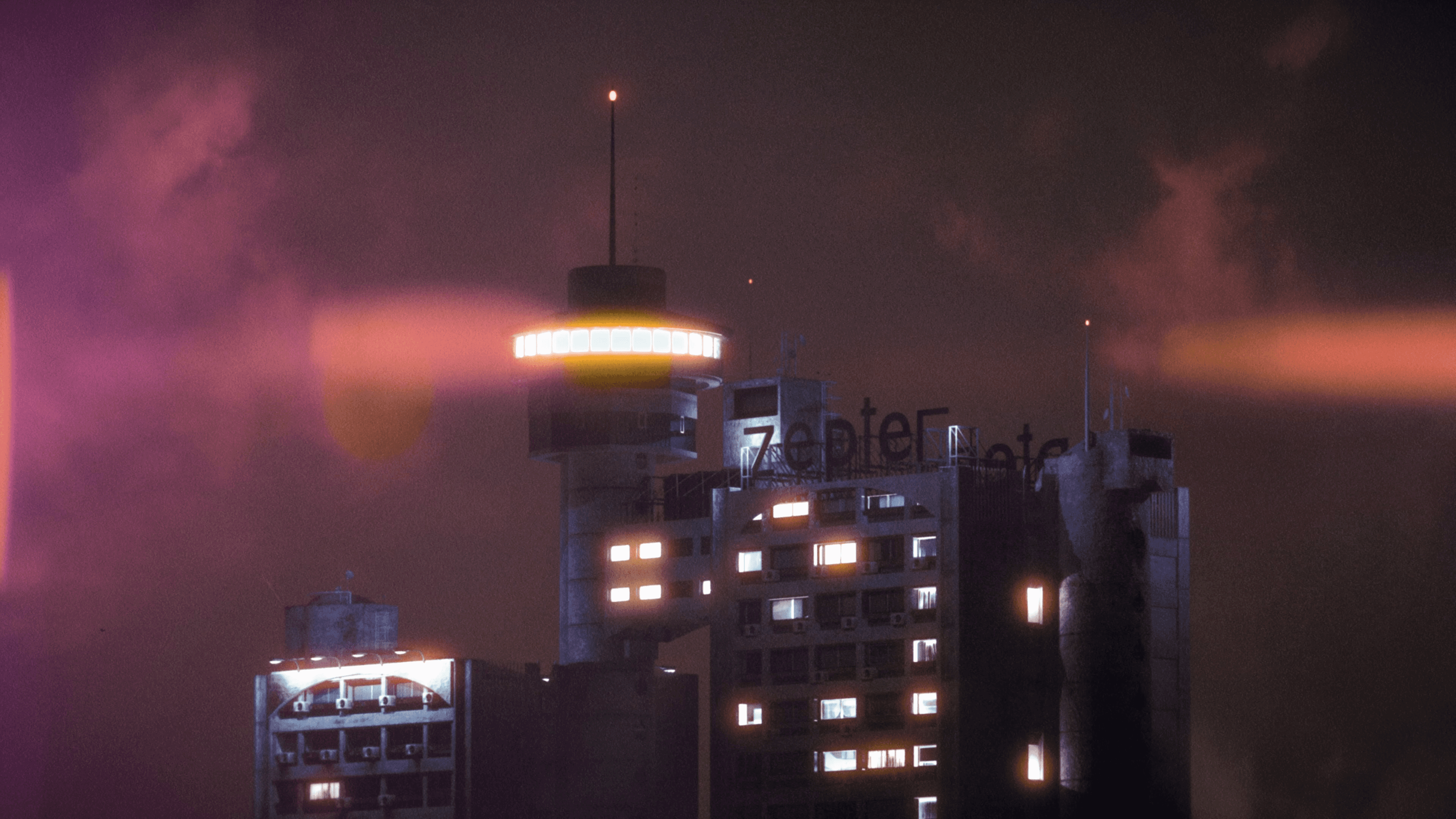 Modeling required strategic simplification—both towers were built from repeating modular elements to maintain efficiency without sacrificing detail. The ground floor is unique, while upper floors repeat with variation introduced through window textures, AC units, and decals applied in Unreal Engine 5. The model was created in Blender, textured in Substance Painter for concrete weathering and material authenticity, then imported into Unreal Engine 5 where the environment came together. Realistic surroundings, dynamic natural and artificial lighting, cloth simulation for the advertising banner, and animated elements—birds, insects, fog, clouds—brought life to the monumental structure.